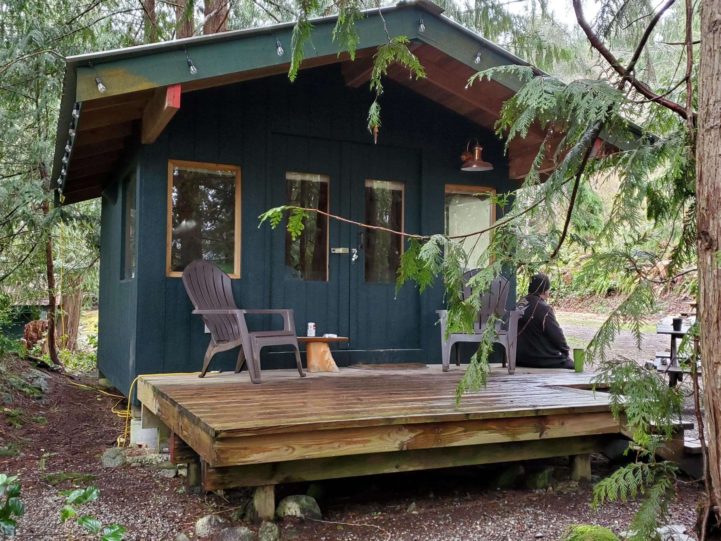 After dark, the cabins are well-lit. Such a peaceful place to sit outside in the daylight or after dark. Bring your own campstove or BBQ and set up at the picnic table or use the firepit for making s’mores. A hammock between the trees is a perfect place for gazing up at the sky through the branches.